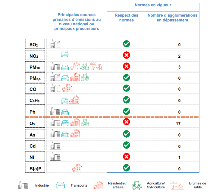 Parmi les douze polluants faisant l’objet de normes réglementaires de qualité de l’air aux niveaux national et européen, quatre présentent des dépassements de ces normes en 2024 : NO2 et PM10 (valeurs limites), O3 et Ni (valeurs cibles). Pour l’O3, ces dépassements (calculés en moyenne sur la période 2022-2024) concernent 17 agglomérations. Pour le NO2, les PM10 et le Ni, ces dépassements ne concernent que respectivement deux, trois et une agglomérations. Pour le NO2, l’ampleur des dépassements et le nombre estimé de personnes exposées à ces dépassements ont diminué drastiquement depuis 2019.