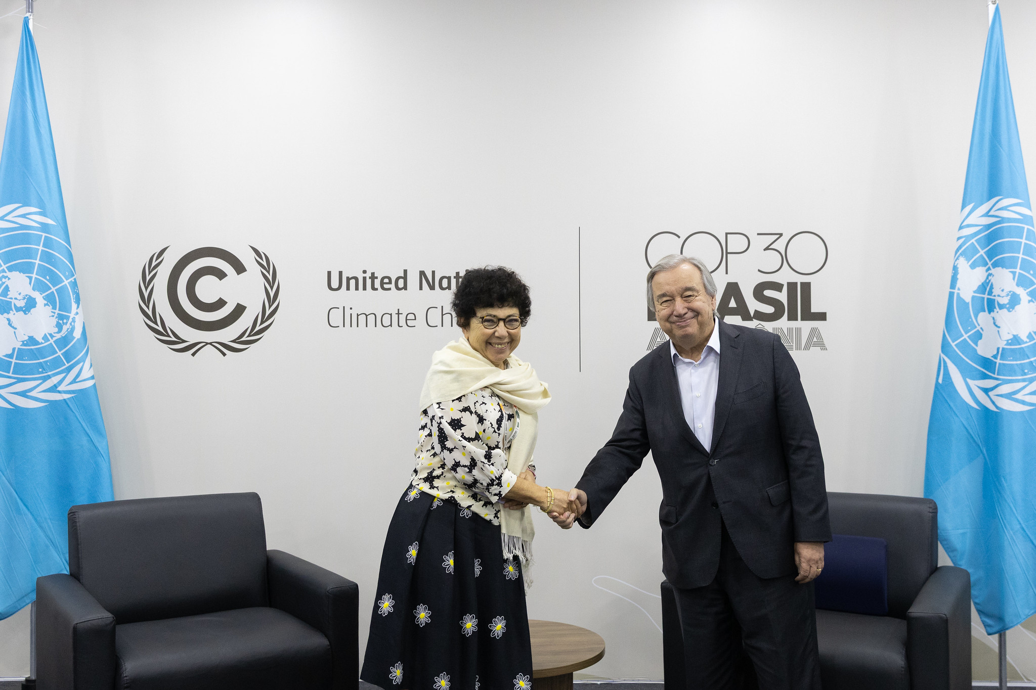 Monique Barbut, ministre de la Transition écologique, avec António Guterres, secrétaire général des Nations unies © UN Climate Change – Kiara Worth