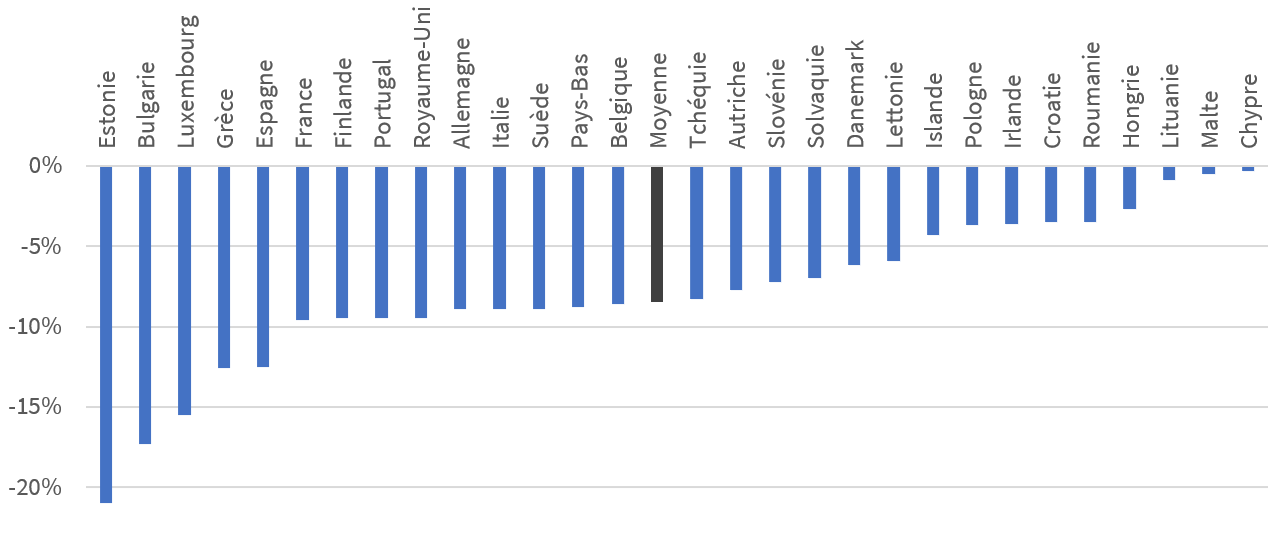 Evolution des émissions de GES par pays (UE27+UK+IS) entre 2019 et 2020, en %