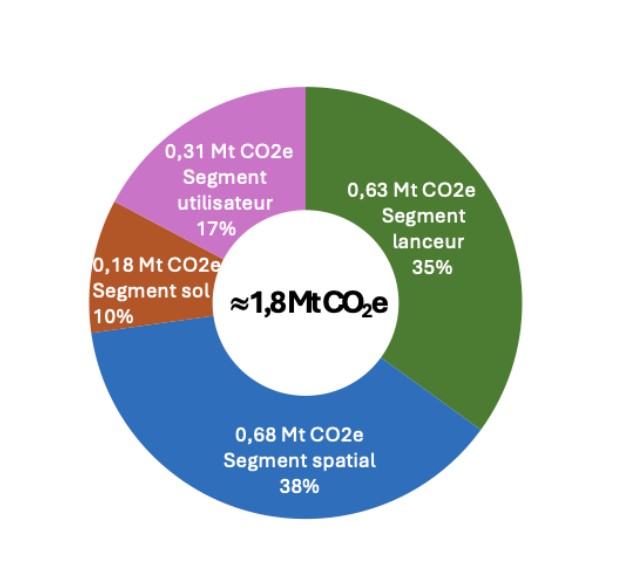 Répartition de l’empreinte carbone de l’industrie spatiale française – Source : Cospace, Carbone 4 – Feuille de route pour une filière spatiale française décarbonée, juin 2025