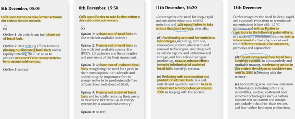 Même si le projet de texte issu des cinq réunions était loin d’être parfait, il représentait le meilleur compromis auquel les membres du comité pouvaient parvenir. Il constituait donc, pour les Parties réunies à Dubaï, une base de discussion, voire une base d’une décision finale à adopter par la COP-28 et la CMA-5.