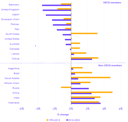 - les pays qui ont enregistré une plus faible hausse 2015-2023 par rapport à 1990-2015 : Chine (+2,47%/an contre +5,0%/an), Arabie saoudite 0,85%/an contre 4,74%/an), Turquie (2,53%/an contre 3,28%/an) ;