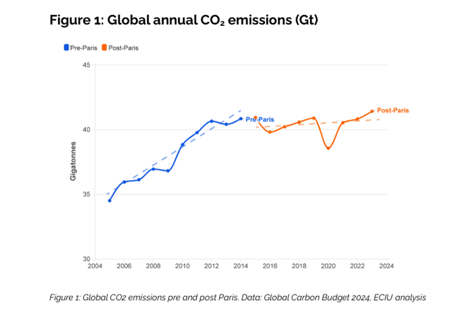 Le 25 septembre 2025, le cercle de réflexion Energy and Climate Intelligence Unit (ECIU), basé à Londres, a publié une note d’analyse sur les émissions mondiales de GES avant et après l’Accord de Paris.