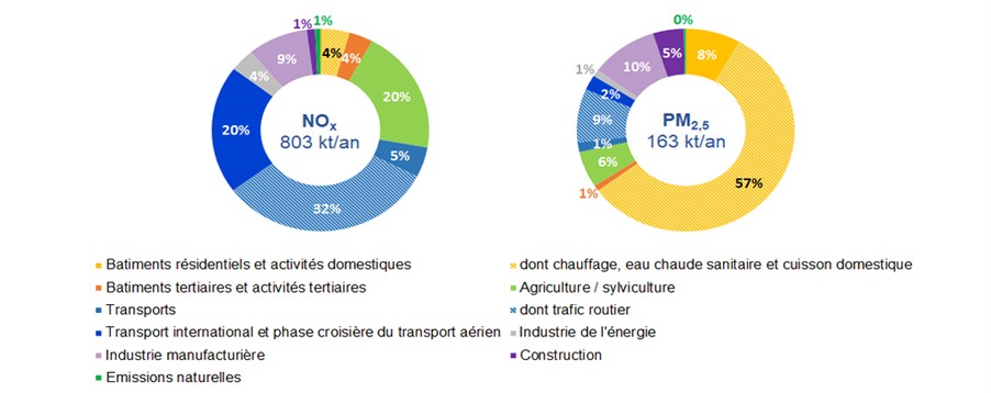Figure 2. Répartition des émissions par secteur en France métropolitaine en 2024 pour les deux principaux types de polluants atmosphériques (NOx et PM2,5) – Source : Citepa, Secten 2025/DG Trésor