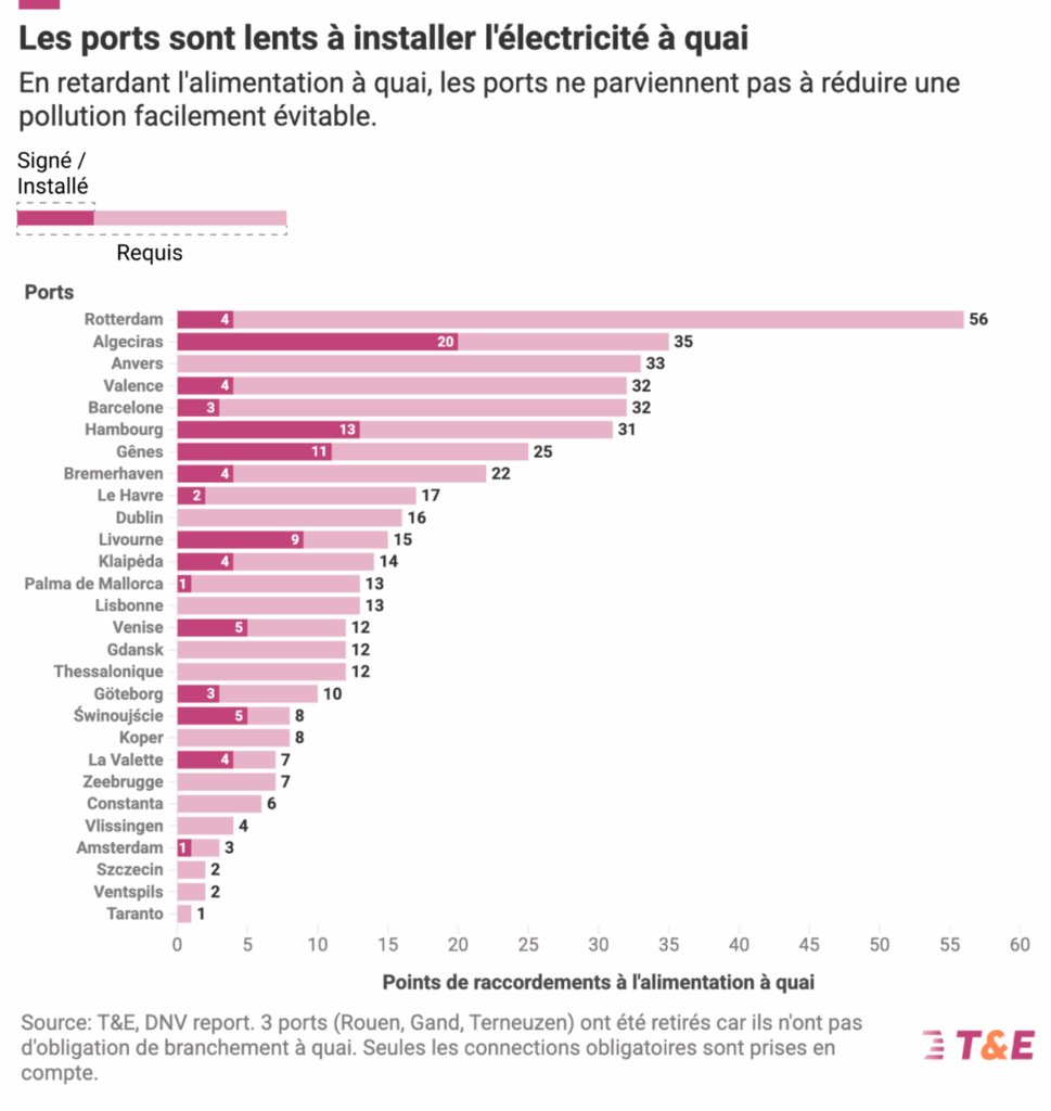 Plus de 6 % des émissions maritimes de CO2 de l’UE proviennent des navires utilisant des combustibles fossiles dans les ports. Outre le CO2, les navires émettent également de grandes quantités d’oxydes de soufre (SOx), d’oxydes d’azote (NOx) et de particules, qui ont des effets importants sur la santé humaine. Dans le cadre du « Green Deal » de l’UE, les ports de l’UE sont tenus de fournir, d’ici 2030, de l’électricité à quai aux navires. L’installation de ces branchements permettrait de diminuer rapidement la pollution atmosphérique dans les villes portuaires. Or sur les 31 ports européens étudiés, seuls quatre avaient, à la fin du premier semestre 2025, installé ou signé un contrat pour plus de la moitié de l’infrastructure électrique requise d’ici 2030 pour le branchement à quai des navires.